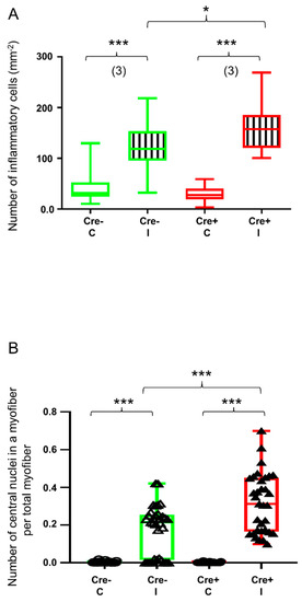 Quantitative histological analysis shows delayed kinetics of regeneration in septin7 downregulated mice. Green color represents Cre− data and red color refers to Cre+ data. Numbers in brackets indicate the number of muscle samples. (A) Number of inflammatory cells per mm2. Inflammatory cells were counted on HE sections from Cre− and Cre+ mice 14 days after BaCl2 injection. Ten images were taken from one section, number of sections = 3 from all groups. (B) Number of centrally located nuclei in regenerating myofibers per total number of myofibers 14 days after injection. Asterisks indicate statistically significant difference (* p < 0.05, *** p < 0.001 Student’s t-test). Actual p value when p > 0.001 is (A) p = 0.024.