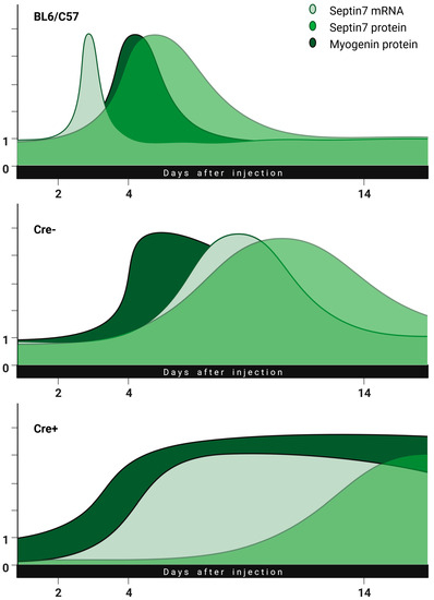 Changes in the regeneration process are illustrated in Figure 8. This combined hypothetical summary figure merges the previous data found in the literature with our idea, to which our measurement points fit well. Changes in the amounts of septin7 mRNA, septin7 protein and myogenin were illustrated as a function of regeneration time in the BL6/C57, Cre− and Cre+ mice. Based on our experiments, we believe that the originally reduced septin7 expression significantly prolongs the regeneration phase. The injury led to an increase in the amount of septin7 in all animals, suggesting that the protein is necessary for regeneration. The use of tamoxifen alone resulted in a slight delay in septin7 production but did not modify its dynamics (a slight shift to the right in the curves for Cre− as compared to BL6/C57 animals). At the same time, the transcription of a sufficient amount of septin7 protein from mRNA happens more slowly in the Cre+ animals while the level of myogenin remains high. It is important to note here that the amount of Sept7 mRNA in the Cre+ animals increased to the point seen in the Cre− mice despite the presence of the floxed gene, indicating that a given amount of septin7 in indispensable for the process. From this, we might conclude that terminal differentiation of myotubes does not take place in the absence of septin7. In this framework, regeneration is not completed until the required amount of septin7 protein is produced, which is indicated by a long-lasting levated myogenin level. The delayed expression of laminin protein in Cre+ animals is also consistent with this hypothesis.