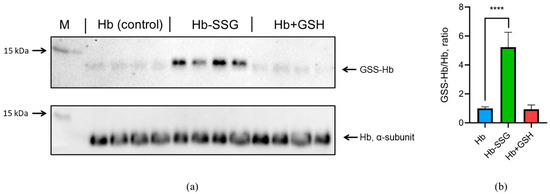 The oxygen saturation of hemoglobin (SaO2—oxygen saturation, %) approaches 100% at an oxygen partial pressure above 17 kPa (128 mmHg) [12]. Therefore, under normal atmospheric conditions with an oxygen partial pressure of about 21 kPa (158 mmHg, at atmospheric pressure of 760 mmHg), almost all purified hemoglobin is in the oxy form (Fe2+ with O2) [12], which was confirmed for our samples by spectrophotometry (Figure S1, Supplementary). To determine the efficiency of methemoglobin (metHb) reduction with sodium dithionite, we used the first derivative of the spectrum at 645 nm according to the protocol described in [13]. The results are presented in Figure S2 (Supplementary). For hemoglobin, hemoglobin after incubation with GSSG, and hemoglobin after incubation with GSH, the content of metHb is less than 2.4%. Thus, the content of metHb is low and the same in all three studied forms of hemoglobin during our experiment. The efficiency of oxyhemoglobin glutathionylation by GSSG was determined using immunoblotting. It was shown that incubation with GSSG resulted in a significant (more than fivefold) increase in oxyhemoglobin glutathionylation (Figure 1). At the same time, there was no increase in glutathionylation during the incubation of hemoglobin with GSH (Figure 1, Figure S3, Supplementary). This confirms our earlier data that incubation with GSH leads to noncovalent complex formation with oxyHb only [3].