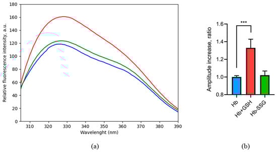 Fluorescence spectrum (a) of oxyHb (blue), oxyHbSSG (green), and oxyHb + GSH (red), λex = 296 nm. Change in the peak amplitude (b) for oxyHb (blue), oxyHbSSG (green), and oxyHb+GSH (red) as the ratio of the peak amplitudes of the samples to the amplitude of the peak in the control. For the calculation, average values were taken in the wavelength range of 329–333 nm. n = 3, *** p = 0.002. (ANOVA).