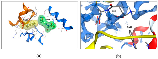 In the previous work, we found that only Trp37.β was involved in the interaction with glutathione [3]. To evaluate the changes in the accessibility of Trp14.α, Trp15.β, and Trp37.β, we calculated the solvent-accessible surface area (SASA) of oxyHb per residue (Table 1). Thus, we found that noncovalent bound glutathione altered the accessibility of both Trp37.β (from 54.9 to 8.0–7.8%) and did not affect other Trp residues’ accessibility (Table 1, Figure 5). Two of four GSH interaction sites were located near Trp37.β, but in one case, there was an H-bond between Trp37.β2 and GSH; in another, there was no H-bond, but GSH was located near Trp37.β1, isolating it from the solvent. The full output data regarding Trp’s SASA are listed in Table 1.