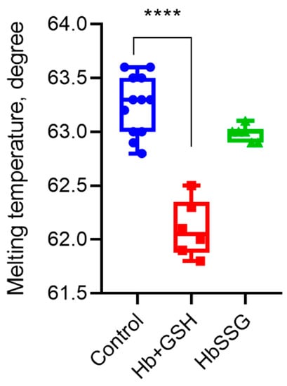 Using differential scanning fluorimetry, we found that glutathionylation did not change the parameter characterizing the globin structure—the melting point of the protein. The formation of a noncovalent complex of hemoglobin with GSH led to a decrease in the melting point and, consequently, the thermal stability of the protein (Figure 6).