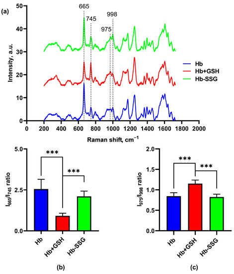 Averaged Raman spectra (a) of hemoglobin oxyHb (blue), oxyHb + GSH (red), and oxyHb-SSG (green). (b) Intensity ratio of the I (665 cm−1)/I (745 cm−1) bands in the Raman spectra. (c) Intensity ratio of the I (975 cm−1)/I (998 cm−1) bands in the Raman spectra. n = 8, *** p < 0.001.