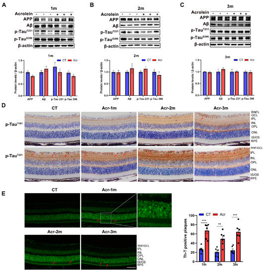 Acrolein partly induced tau accumulation in mice retina. (A–C) Western blot and quantification of the levels of amyloid precursor protein (APP), β-amyloid (Aβ) and phosphorylated Tau (p-Tau) in the retina in the control group and the acrolein groups. (D) Representative immunohistochemistry (IHC) staining for p-TauT181 or p-TauT231 antibodies (red arrow) in the retinas. (E) Representative staining and analysis of thioflavin T (ThT)-positive plaques (red arrow) in the retinas of mice. n = 4–7 for Western blot, n = 6 for IHC and ThT staining. Student’s t-test was used. Data are presented as mean ± SEM. ** p < 0.01, *** p < 0.001 vs. control. Abbreviations: RNFL = retinal nerve fiber layer, GCL = ganglion cell layer, IPL = inner plexiform layer, INL = inner nuclear layer, OPL = outer plexiform layer, ONL = outer nuclear layer, IS/OS = photoreceptor inner and outer segment, RPE = retinal pigment epithelium. Scale bar: 50 μm.