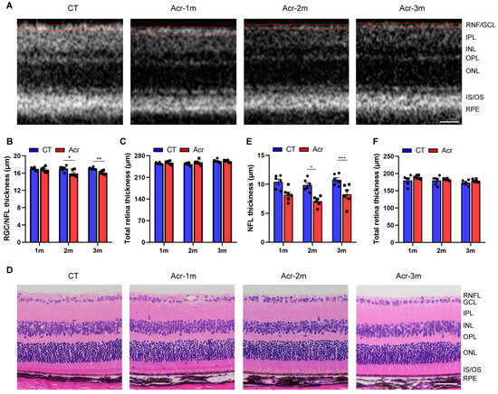 To explore whether acrolein can cause retinal thickness defects, optical coherence tomography (OCT) and hematoxylin and eosin (H&E) staining were used for detection. Compared with the control group, there was a significant decrease in RNF/GCL in the acrolein groups of 2 and 3 months (p < 0.05, p < 0.01, respectively), but not in the acrolein group of 1 month. In the analysis of total retina (TR) thickness, there was no significant difference between the acrolein groups and control group (Figure 2A,B).