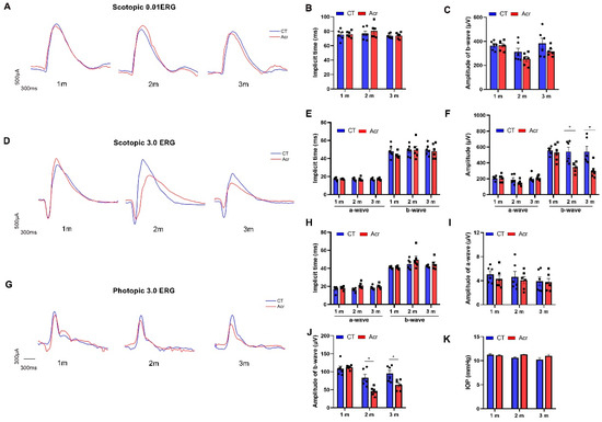 Acrolein induced abnormal visual function in mice. (A) Representative traces, and (B,C) analysis of implicit time and amplitude of the b-wave in scotopic 0.01 electroretinogram (ERG). (D) Representative traces of scotopic 3.0 ERG, and (E,F) analysis of implicit time and amplitude of a- or b-waves in scotopic 3.0 ERG. (G) Representative traces, and (H–J) analysis of implicit time and amplitude of a- or b-wave in photopic 3.0 ERG. (K) Mean intraocular pressure (IOP) of mice. n = 6 for each group. Student’s t-test was used. Data are presented as mean ± SEM. * p < 0.05 vs. control.