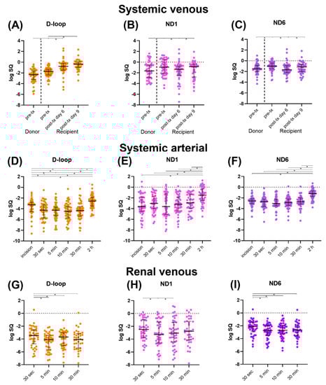 Median mtDNA levels (D-loop, ND1, and ND6) with interquartile range, log transformed. (A–C): Systemic venous levels. (D–F): Systemic arterial levels. (G–I): Renal venous levels. Abbreviations: D-loop: displacement loop, ND1: NADH ubiquinone oxidoreductase subunit 1, ND6: NADH ubiquinone oxidoreductase subunit 6, pre-tx: pre-transplantation, post-tx: post-transplantation. * = p-value < 0.05.