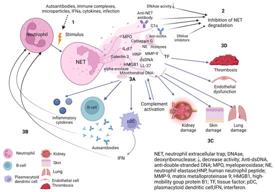 The role of NETs in the pathogenesis of systemic lupus erythematosus. (1) Different stimuli trigger neutrophil activation with increased NETs release. (2) Deficiency, decreased activity of DNAse or presence of DNAase inhibitors and factors protecting NETs from degradation (C1q, anti-NET antibodies, anti-dsDNA) prevent efficient NET clearance. Increased synthesis and/or impaired degradation of NETs contribute to NETs persistence in tissues and circulation. (3A) NETs components are immunogenic and activate B cells to synthesise autoantibodies and plasmacytoid dendritic cells to synthesise interferons and the complement system. (3B) Autoantibodies, proinflammatory cytokines, and IFN activate neutrophils to release NETs, which contribute to a vicious cycle of inflammation. (3C) The components of NETs cause damage to their own tissues with the development of endothelial dysfunction, damage and fibrosis of the kidney, lungs and skin. (3D) NETs components affect the hemostasis system and provide a scaffold for thrombus formation. Created with BioRender.com.
