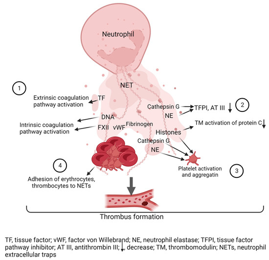 Several components of NETs directly or indirectly activate the coagulation cascade. For example, NETs components upregulate the expression of coagulation factor genes [107]. Oehmcke et al. [108] showed that intact NETs were able to bind and activate factor XII on their surface and trigger the contact pathway of coagulation activation in vitro. The role of histones and DNA from NETs in the formation of hypercoagulation is still under debate. It has been shown [102] that isolated histones and DNA can activate the intrinsic coagulation pathway, but not intact NETs. In contrast, Gould et al. [109] showed that intact NETs were able to activate the intrinsic coagulation pathway in a DNA-dependent manner. Wang et al. [110] found that intact NETs bound to neutrophil microparticles and the complex formed activated thrombin synthesis via the XII-dependent pathway, but not the extrinsic coagulation pathway. NETs have also been shown to participate in the activation of the extrinsic pathway of blood coagulation via the expression of tissue factor [111,112] or the induction of TF expression by endothelial cells [113]. The components of NETs were able to inhibit the function of natural anticoagulants and the fibrinolytic activity of blood. For example, cathepsin G and neutrophil elastase destroyed the tissue factor pathway inhibitor (TFPI) [114] and antithrombin III [115], and histones were able to interfere with thrombomodulin-dependent activation of protein C [116].