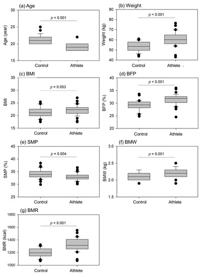 Age, weight, and body composition indices (BCIs), such as body mass index (BMI), body fat percentage (BFP), skeletal muscle percentage (SMP), bone mass weight (BMW), and basal metabolic rate (BMR) in the control (n = 30) and athlete groups (n = 35). Statistical analyses were performed using the Mann–Whitney U test (a,d,f) or Student’s t-test (b,c,e,g). Statistical differences in age (a), weight (b), BFP (d), SMP (e), BMW (f), and BMR (g) were observed as each p value is shown in each panel.