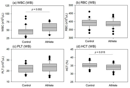 Blood cell counts and hematocrit (HCT) levels in whole-blood (WB) samples from the control (n = 30) and athlete (n = 35) groups. Statistical analyses were performed using the Mann–Whitney U test (a) or Student’s t-test (b–d). Statistically significant differences were observed between the WBC (a) and HCT (d) as each p value is shown in each panel.
