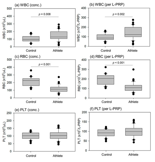 Blood cell counts in leukocyte-rich PRP (L-PRP) preparations of the control (n = 30) and athlete (n = 35) groups. The concentrations of white blood cell (WBC), red blood cell (RBC), and platelet (PLT) are depicted in panels (a,c,e), respectively, while the total cell counts per L-PRP preparation are shown in panels (b,d,f). Statistical differences were observed in WBC (a,b) and RBC (c,d) counts as each p value is shown in each panel.
