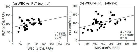 Comparisons of the correlations between total WBC and PLT counts in the L-PRP preparations are shown in Figure 4. These correlations were positive in both groups, but the levels of correlation were moderate (R = 0.454, p = 0.00612) and weak (R = 0.355, p = 0.0546) in athletes and controls, respectively.