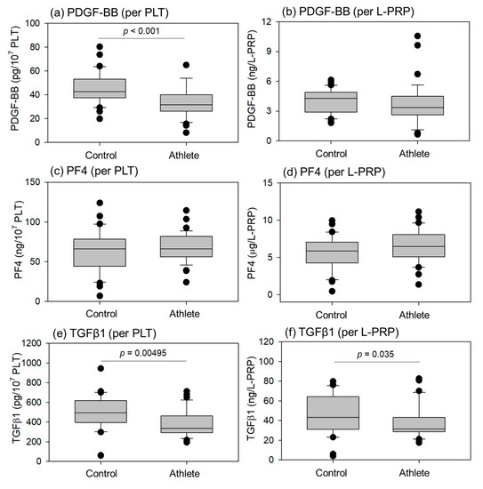 Levels of PDGF-BB (a,b), PF4 (c,d), and TGFβ1 (e,f) in L-PRP preparations of the control (n = 30) and athlete groups (n = 35). Statistical analyses were performed using the Mann–Whitney U test (a,b,f), Welch’s t-test (c), or Student’s t-test (d,e). Each p value is shown in each panel.