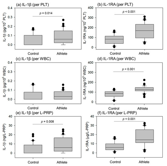 Levels of interleukin-1β (IL-1β) (a,c,e) and IL-1 receptor antagonist (IL-1RA) (b,d,f) in leukocyte-rich PRP (L-PRP) preparations of the control (n = 30) and athlete groups (n = 35). Each level was normalized by platelet (PLT) count (a,b), white blood cell (WBC) count (c,d), or L-PRP preparation (e,f). Statistical analyses were performed using the Mann–Whitney U test (a,e,f), Welch’s t-test (b,d), or Student’s t-test (c). Each p value is shown in each panel.