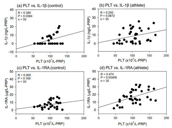 Correlations between platelet (PLT) counts and interleukin-1β (IL-1β) (a,b) or IL-1 receptor antagonist (IL-1RA) (b,d) in leukocyte-rich PRP (L-PRP) preparations of the control (a,c) (n = 30) and athlete groups (b,d) (n = 35). The strength of the associations was analyzed by the Pearson correlation coefficient. The strength of the correlation was defined as very strong (0.8–1.0), strong (0.6–0.79), moderate (0.4–0.59), weak (0.2–0.39), and very weak (0–0.19).