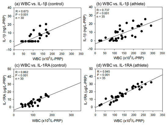 Correlations between white blood cell (WBC) counts and interleukin-1β (IL-1β) (a,b) or IL-1 receptor antagonist (IL-1RA) (b,d) in L-PRP preparations of the control (a,c) (n = 30) and athlete groups (b,d) (n = 35). The strength of the associations was analyzed by the Pearson correlation coefficient. The strength of the correlation was defined as very strong (0.8–1.0), strong (0.6–0.79), moderate (0.4–0.59), weak (0.2–0.39), and very weak (0–0.19).