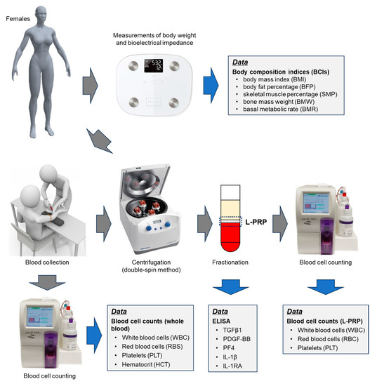 However, this pilot study requires further investigations. Firstly, the sample size was too small to reach firm conclusions. Although these tendencies are reproducible, the absolute values of the individual parameters cannot be considered reproducible. Secondly, blood collection from the same donor was not repeated to determine the reproducibility. Regarding the levels of growth factors associated with platelets, pure PRP preparations are better suited for obtaining reproducible data. Because L-PRP is frequently used in the treatment of injured female athletes in affiliated hospitals, we chose L-PRP for subsequent analyses. Thirdly, the BCI data were neither accurate nor absolute. Assuming that the BCIs were measured upon blood collection in related hospitals, we adopted a bioelectrical impedance analysis (BIA) technique to conveniently measure body composition indices. However, BIA is inferior to densitometry and other X-ray-based techniques in terms of its accuracy and reliability. Thus, these data should be compared among groups measured using the same instrument.