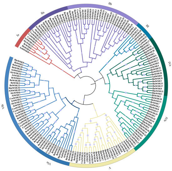 Phylogenetic analysis of 9 Cruciferous species’ WAK members. According to the alignment of the WAK domain, a phylogenetic tree was constructed using the neighbor-joining (NJ) method with the default parameters and 1000 bootstrap replicates. Based on the results of phylogenetic analysis, the WAK members of 9 cruciferous species were divided into 9 subfamilies, denoted by the Roman numerals from Ia to IVb.