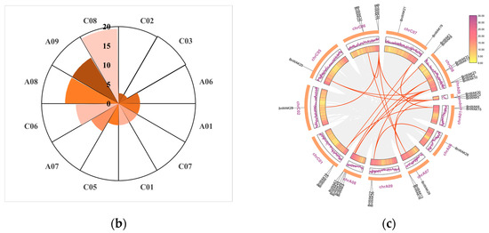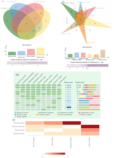 B. napus was compared with four Arabidopsis plants and C. sativa. As shown in Figure 6b, there were three core gene clusters among those plants. It is worthwhile to mention that the Arabidopsis plants have no specific core gene clusters, except for C. sativa and B. napus, which have specific gene clusters. This result demonstrates that the Cruciferous plants have retained their affinities in evolution while also having evolutionary specificity among the subfamilies. A detailed list of direct gene clusters and single examples of gene clusters is given in Table S2.