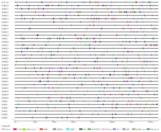 According to information about physical location, the BnWAK genes were located on the 12 chromosomes of B. napus (Figure 3). BnWAK genes are evenly distributed across chromosomes. There were 17 BnWAKs on the A subgenome and 19 BnWAKs on the C subgenome. It was found that there were 1 to 7 BnWAK genes on each chromosome, with the densest distributions occurring on ChrC08 (7), then ChrA08 (5) and ChrC06 (4). There are also some regions, including ChrC02, ChrC03 and ChrC05, with only one BnWAK gene. Out of 36 BnWAK genes, the exact chromosomal positions of the 5 genes located on A06_random, A09_random and C05_random were unknown. In B. napus, the quantity of WAK genes is not significantly correlated with chromosome length.