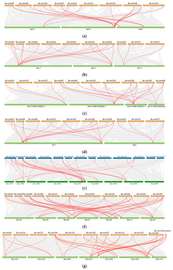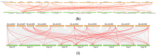 To investigate the homology and evolutionary relationships between WAK genes, nine Cruciferous species (A. thaliana, A. lyrate, A. helleri, A. alpina, C. sativa, B. juncea, B. rapa, B. carinata and B. oleracea) and B. napus were subjected to a synteny analysis (Figure 5). The results showed that BnWAK genes were homologous in all nine species, with 20 pairs with A. alpina (Figure 5a), 22 pairs with A. lyrate (Figure 5b), 25 pairs with A. helleri (Figure 5c), 23 pairs with A. thaliana (Figure 5d), 41 pairs with B. juncea (Figure 5e), 50 pairs with B. oleracea (Figure 5f), 36 pairs with B. rapa (Figure 5g), 65 pairs with B. carinata (Figure 5h) and 56 pairs with C. sativa (Figure 5i), suggesting that these WAK gene pairs may have come from a common ancestor and had the same function.