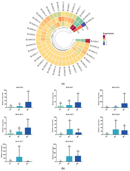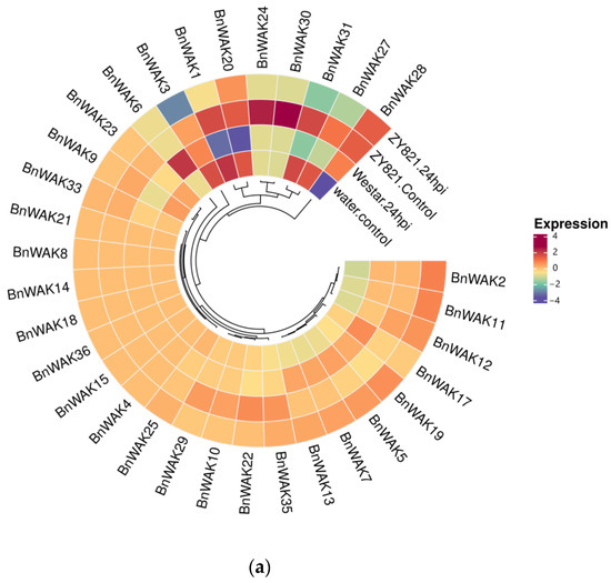 Based on transcriptome data of B. napus under different biotic stresses published on NCBI, the expression of BnWAKs under different biotic stresses was analyzed. The results showed that BnWAKs expressed differently under different stress treatments (Figure 7).
