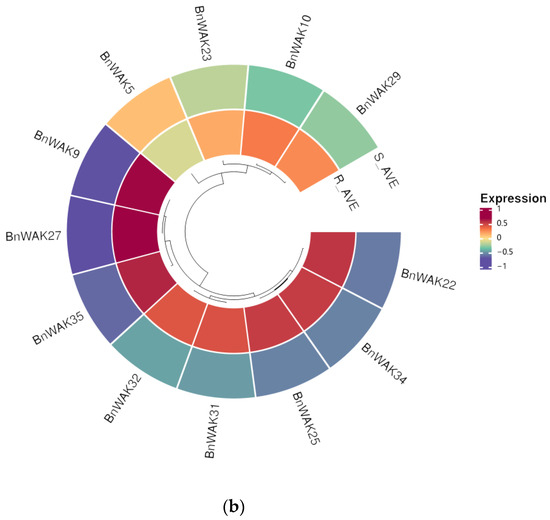 An analysis of transcriptome data from two varieties of B. napus, tolerant and susceptible, revealed significant differences in the expression of some WAK proteins between the two varieties following Sclerotinia sclerotiorum infection. The susceptible varieties BnWAK24, 30 and 31 showed some increase after infection with S. sclerotiorum, while BnWAK2, 11, 19 and 5 showed some decrease after infection. Among the tolerant species, BnWAK1, 3, 9, 20, 23, 31 and 27 showed some increase, while BnWAK2, 28, 11 and 12 showed some decrease, especially BnWAK28 (Figure 7a). Not coincidentally, powdery mildew caused with Cruciferous powdery mildew is an epidemic disease of B. napus growing worldwide. An analysis of the foliar transcriptome of immune varieties ‘White Flower’ and susceptible varieties ‘Zhong Shuang 11’ showed the highest expression of BnWAK5 in the immune variety and BnWAK35, 32, 25, 29 and 10 in the susceptible variety (Figure 7b).