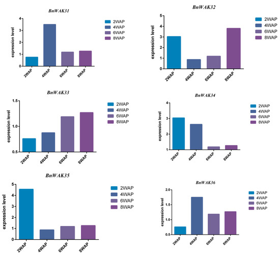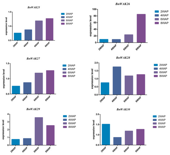 All BnWAK genes were analyzed using an RNA-seq analysis at 2, 4, 6 and 8 weeks after pollination to determine their potential functions during fatty acid biosynthesis. The results indicated that 36 BnWAK genes tended to change their expression during fatty acid biosynthesis (Figure 9). Especially, the expression of BnWAK6, 7 and 12 were significantly upregulated between 2 and 4 weeks and dramatically downregulated after 4 weeks after pollination, which exhibited a tight relationship with the biosynthesis of fatty acids. In contrast, the expression of BnWAK10, 26 and 29 was at a low level between 2 and 4 weeks, but showed a significant raise after 6 weeks, which suggested the connection with the degradation of fatty acids. After pollination, the expression of several genes, such as BnWAK4, 9, 14, 18, 20, 25, 27 and 33, was always upregulated, indicating that these genes may be related to seed development. As a whole, different BnWAK genes exhibited different expression patterns during fatty acid biosynthesis, even duplicated genes.
