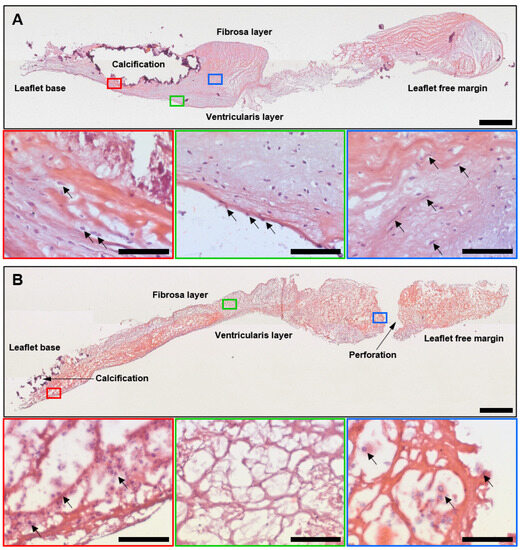 Histological examination of calcified AVs and SVD-affected BHVs. (A) AVs excised from the patients with CAS because of critical leaflet thickening and severe calcification. Aside from calcification, the fibrotic ECM retained its integrity. Macrophage spread was limited to areas with a degraded ECM around the calcium deposits (demarcated by a red contour; macrophages are indicated by black arrows), whilst the AV surface (demarcated by a green contour) was covered by VECs (indicated by black arrows) and the fibrotic ECM (demarcated by a blue contour) was populated by VICs (indicated by black arrows). The fibrosa layer (aortic, or outflow side) is on the top, whereas the ventricularis layer (ventricular, or inflow side) is at the bottom of the section; (B) In comparison with AVs, BHVs suffered from ECM disintegration and the fibres were loosened. Immune cells were located at the base of the leaflets and near the mineral deposits (demarcated by a red contour; immune cells are indicated by black arrows). Areas devoid of host cells (indicated by a green contour) alternated with cellular infiltrations associated with perforations and tears (indicated by a blue contour; immune cells are indicated by black arrows). The fibrosa layer (aortic, or outflow side) is on the top, whereas the ventricularis layer (ventricular, or inflow side) is at the bottom of the section. The bottom images within each group (demarcated by red, green, and blue contours; ×200 magnification, scale bar: 100 μm) are close-ups of the top images (overview; scale bar: 1000 μm). Haematoxylin and eosin staining.