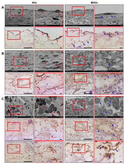 Side-by-side comparison of ultrastructural (EM-BSEM) and immunohistochemical analysis of calcified AVs and SVD-affected BHVs. (A) ECs had distinct appearance in AVs and BHVs: AVs (left images) were covered with a monolayer of VECs (indicated by red arrows) that had an elongated shape and a large nucleus oriented towards the flow, and were positive for the canonical EC marker CD31, whilst BHVs (right images) were lined with endothelial-like cells (indicated by blue arrows) that had a bigger size, lower nucleus-to-cytoplasm ratio, and contained noticeable inclusions, being also slightly positive for CD31. Note the concordance of ultrastructural and immunohistochemical analysis in the AVs and the detailed rather than vague phenotype of endothelial-like cells in the BHVs when examined by EM-BSEM, but not immunohistochemical staining. EM-BSEM: top images, immunohistochemical staining: bottom images; (B) Mesenchymal cells were abundant in the AVs (VICs, left images, indicated by red arrows) and were positive for α-SMA, but were rarely encountered in the BHVs, where they showed lower α-SMA expression (myofibroblasts, right images, indicated by blue arrows). EM-BSEM: top images, immunohistochemical staining: bottom images; (C) Although macrophages were observed in both AVs and BHVs, and were detected mostly around calcium deposits and in the degraded ECM, the AVs (left images) were infiltrated exclusively by canonical, CD45+, and CD68+ macrophages (indicated by red arrows), which significantly differed from the large ECM-digesting macrophages and multinucleated foreign-body giant cells (indicated by blue arrows) within the BHVs, which were also positive for CD45 and CD68 (right images). Note that the ultrastructural analysis of the macrophages permits the assessment of their ECM-digesting activity, whilst immunohistochemistry does not. Note the fibrotic ECM of the AVs and the loosened ECM of the BHVs, which is clearly visualised in the EM-BSEM but not the immunohistochemical staining. EM-BSEM: top images, immunohistochemical staining: bottom images. The right images within each group (demarcated by a red contour; EM-BSEM: ×2500 magnification, scale bar: 20 μm; immunohistochemistry: ×1000 magnification, scale bar: 10 μm) are close-ups of the corresponding left images (overview; EM-BSEM: ×1000 magnification, scale bar: 50 μm; immunohistochemistry: ×400 magnification, scale bar: 100 μm).