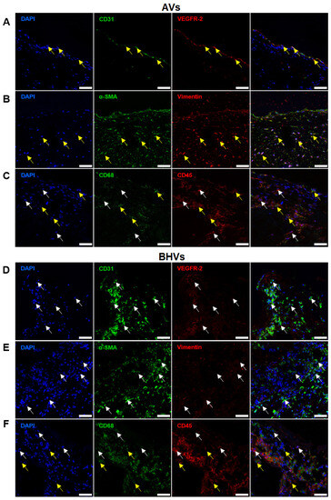 Immunofluorescence staining of AVs and BHVs with antibodies to EC (CD31 and VEGFR2), contractile (α-SMA and VIM), and immune-cell (CD45 and CD68) markers. (A) AVs, staining for CD31 (green) and VEGFR2 (red), and ECs (CD31+VEGFR2+ cells) are indicated by yellow arrows; (B) AVs, staining for α-SMA (green) and VIM (red), and VICs (α-SMA+VIM+ cells) are indicated by yellow arrows; (C) AVs, staining for CD68 (green) and CD45 (red), and CD45+CD68- cells are indicated by white arrows, and CD45+CD68+ cells are indicated by yellow arrows; (D) BHVs, staining for CD31 (green) and VEGFR2 (red), and CD31+VEGFR2- cells are indicated by white arrows; (E) BHVs, staining for α-SMA (green) and VIM (red), and α-SMA+VIM- cells indicated by white arrows; (F) BHVs, staining for CD68 (green) and CD45 (red), and CD45+CD68− and CD68+CD45− cells are indicated by white arrows, and CD45+CD68+ cells are indicated by yellow arrows. Nuclei are counterstained with 4′,6-diamidino-2-phenylindole (DAPI, blue). Magnification: ×400, scale bar: 50 μm.