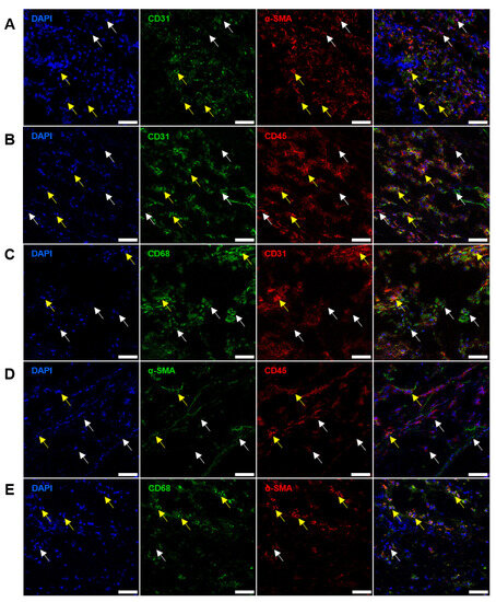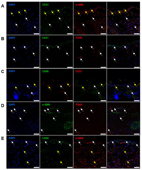 Immunofluorescence staining of BHVs with antibodies to: (A) CD31 (green) and α-SMA (red), α-SMA+CD31− cells are indicated by white arrows, and CD31+α-SMA+ are indicated by yellow arrows; (B) CD31 (green) and CD45 (red), CD31+CD45− and CD45+CD31− cells are indicated by white arrows, and CD31+CD45+ cells are indicated by yellow arrows; (C) CD68 (green) and CD31 (red), CD68+CD31− cells are indicated by white arrows, and CD68+CD31+ cells are indicated by yellow arrows; (D) α-SMA (green) and CD45 (red), α-SMA+CD45− and CD45+α-SMA− cells are indicated by white arrows, and α-SMA+CD45+ cells are indicated by yellow arrows; (E) CD68 (green) and α-SMA (red), α-SMA+CD68− cells are indicated by white arrows, and CD68+α-SMA+ cells are indicated by yellow arrows. Nuclei are counterstained with DAPI (blue). Magnification: ×400, scale bar: 50 μm.