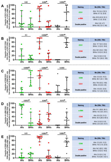 Quantitative image analysis (count of positive cells) of immunofluorescence stainings performed in the AVs and BHVs. (A) CD31 and α-SMA staining, the proportions of CD31+α-SMA−, CD31−α-SMA+, and CD31+α-SMA+ cells on the images are represented by green dots, red squares, and black inverted triangles, respectively; (B) CD31 and CD45 staining, the proportions of CD31+CD45−, CD31−CD45+, and CD31+CD45+ cells on the images are represented by green dots, red squares, and black inverted triangles, respectively; (C) CD68 and CD31 staining, the proportions of CD68+CD31−, CD68−CD31+, and CD68+CD31+ cells on the images are represented by green dots, red squares, and black inverted triangles, respectively; (D) α-SMA and CD45 staining, the proportions of α-SMA+CD45−, α-SMA−CD45+, and α-SMA+CD45+ cells on the images are represented by green dots, red squares, and black inverted triangles, respectively; (E) CD68 and α-SMA staining, the proportions of CD68+α-SMA−, CD68−α-SMA+, and CD68+α-SMA+ cells on the images are represented by green dots, red squares, and black inverted triangles, respectively; Colours of the dots on each plot (green, red, and black) correspond to the antigen indicated in the table at the right side. Each dot, square, or inverted triangle on the plots represents one image (n = 9–10 measurements per group). Whiskers of the 25th–75th percentiles and centre lines indicate the median. The p values are provided above the plots, and statistically significant p values are marked by asterisks; Mann–Whitney U-test.