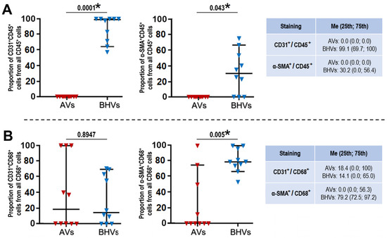 Quantitative image analysis (calculation of the proportions of CD31+/CD45+, α-SMA+/CD45+, CD68+/CD31+, and CD68+/α-SMA+ to all CD45+ and CD68+ cells) of immunofluorescence stainings performed in the AVs and BHVs. (A) CD31/CD45 and α-SMA/CD45 stainings showing the proportions of CD31+CD45+ cells (left image) and α-SMA+CD45+ cells (right image) in AVs (red inverted triangles) and BHVs (blue inverted triangles) to all CD45+ cells; (B) CD31/CD68 and α-SMA/CD68 stainings showing the proportions of CD31+CD68+ cells (left image) and α-SMA+CD68+ cells (right image) in AVs (red inverted triangles) and BHVs (blue inverted triangles) to all CD68+ cells. Each inverted triangle on the plots represents one image (n = 9–10 measurements per group). Whiskers of the 25th–75th percentiles and centre lines indicate the median. The p values are provided above the plots, and statistically significant p values are marked by asterisks; Mann–Whitney U-test.