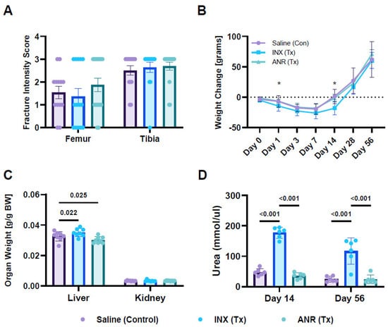 Assessment of Fracture Induction, Body/Organ Weights and Biofluid Changes Following IAF and Treatment with ANR. (A) Intensity score of induced IAF. (B) Change in body weight over time, normalized to pre-injury starting weight. (C) Terminal (Day 56) endpoint organ weight, normalized to endpoint body weight. (D) Urea content measured from isolated synovial fluid samples. Treatment groups were saline (Control), INX (Tx) and ANR (Tx). Values are the mean ± SEM of n = 6–8 biologic replicates. p-values are listed on each figure section unless otherwise indicated. * p < 0.05.