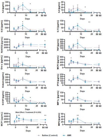 The expression levels of various cytokines and chemokines were analyzed to investigate the systemic inflammatory response (Figure 2). ANR treatment was found to decrease the expression of IL-1β (~3.5-fold, p < 0.05), IL-2 (~4-fold, p < 0.05), IL-13 (>4-fold, p < 0.01), CXCL1 (~5-fold, p < 0.05), and G-CSF (>15-fold, p < 0.05), but not IL-4, at Day 14 post-injury. Expression of TNFα was found to be increased by ANR treatment (>2-fold, p < 0.05). Likewise, ANR treatment was also found to influence the expression levels of MCP-1 (CCL2) at all time points, MCP-3 (CCL7) at Day 3 post-injury, MIP1a (~2-fold, p < 0.05) and MIP2 (over 2-fold, p < 0.05) at Day 7 post-injury, and RANTES (CCL5) at Day 56 post-injury, all relative to saline controls.