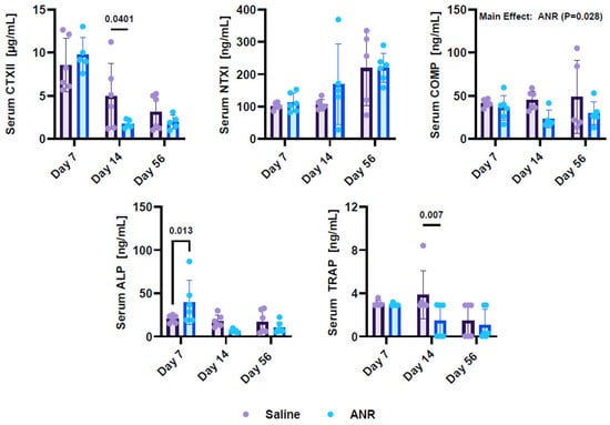 Osteochondral turnover markers were measured in serum throughout the wound healing timeline (Figure 3). Osteoblast activity, as measured by ALP expression, was shown to be increased (p = 0.013) at Day 7 post-injury, compared to the saline control group, but there was no difference between groups at later timepoints (Day 14 and Day 56). Osteoclast activity, as measured by TRAP expression, was shown to be reduced (p = 0.007) at day 14 post-injury in the ANR-treated group relative to the saline control group. Serum COMP, a measure of cartilage breakdown, was reduced with ANR treatment across all study endpoints (Main Effect, p = 0.028). NTX1, a measure of bone breakdown, was not differentially expressed between groups over time, but was increased as a function of time (p = 0.002). Serum CTXII was reduced with ANR at day 14 post-injury (p = 0.040).