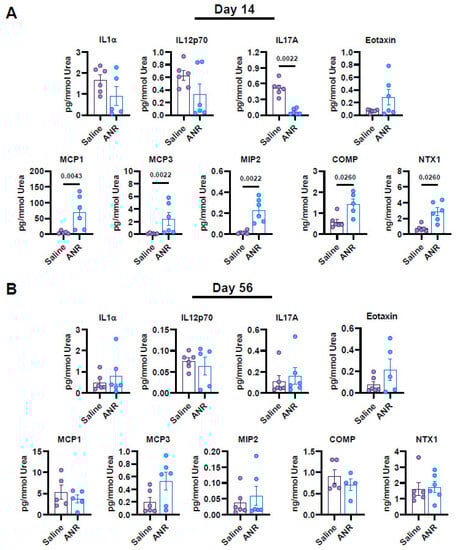 ANR treatment was found to reduce the expression of IL-17A (p < 0.01) at Day 14, compared to the saline control group (Figure 4). It was also found to increase the expression of chemokines MCP-1 (p < 0.01), MPC-3 (p < 0.01) and MIP2 (p < 0.01) as well as osteochondral breakdown markers COMP (p < 0.5), and NTX1 (p < 0.05). Data analyzed from Day 56 samples revealed no differences between saline and ANR treatment.