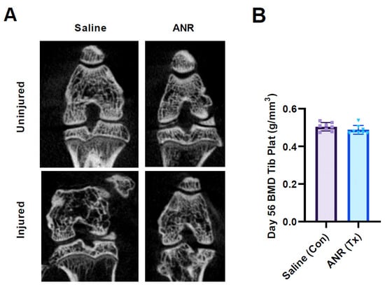 Representative µCT scans and Bone Mineral Density (BMD) at Terminal (Day 56) Endpoint. (A) Representative reconstructed in vivo µCT scans cut in the coronal plane of the entire articular joint from uninjured and injured Saline, uninjured and injured ANR treated animals. (B) Bone mineral density measured at the segmented tibial epiphysis (Plateau) from saline (Con) and ANR (Tx) treated animals. Dotted line represents mean BMD values of contralateral limbs. Values are the mean ± SEM of n = 6 biologic replicates. p-values are listed on each figure section unless otherwise indicated.