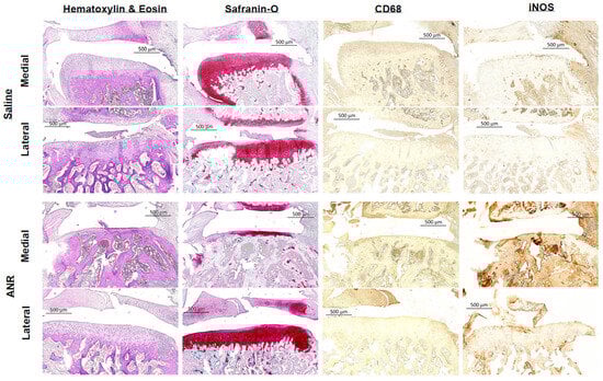 Histological/Immunohistochemical Sections Following IAF and IL-1 Inhibition at Early Terminal (Day 14) Endpoint. Left Tibias harvested at Day 14 post-injury. Top half of panel represents images from medial and lateral stained tissues harvested from Saline treated animals. Bottom half of panel represents medial and lateral aspects of stained tissues harvested from ANR treated animals. Panels were stained for cellularity (H&E), sGAG (Saf O), pan macrophage (CD68) and M1 expression (iNOS). Images are representative of n = 6 biologic replicates.