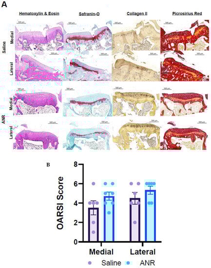Histological analysis of samples at 14 days post-injury (Figure 6) revealed less inflammatory infiltration via H&E staining and more robust sGAG content via Safranin-O staining in the ANR treatment group relative to the control group. Staining for CD68 and iNOS suggests a qualitative reduction in macrophage abundance and pro-inflammatory activity with the ANR treatment group relative to the saline controls. Analyses at 56 days post-injury (Figure 7) revealed greater calcified cartilage in the medial and lateral aspects of the articular cartilage in the saline treated group compared to the ANR control group. Safranin O staining revealed an overall reduction in sGAG in both Saline and ANR treated groups. Staining for Type II collagen did not reveal any qualitative differences between groups. OARSI scoring of the 56-day samples revealed no differences between the Saline and ANR treatment groups (Figure 7).