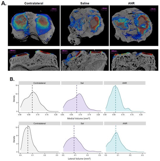 Contrast-enhanced µCT scans (Figure 8A) were used to map the density distribution of sGAGs within the articular surface of tibias at 56 days post-injury. The results show that IAF induced changes to the sGAG density and distribution in both groups, compared to the contralateral limbs. Binning density distribution as a function of volume (Figure 8B) reveals that IAF induces changes in sGAG density distribution, and ANR treatment does not alter this basal outcome. The medial density vs volume plot shows that saline treatment increased the volume distribution but reduced the overall density of the cartilage, whereas with ANR treatment, there was a slight shift to the left indicating less volume overall but with a large increase in density at all volume measures. The lateral (bottom) panel shows that the ANR treatment increased overall density relative to saline and was like the contralateral measurements.