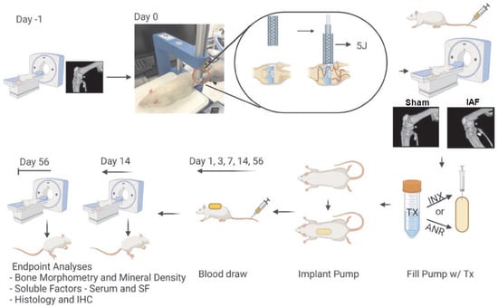 Induction of Intraarticular Fracture, Treatment Procedures and Data Collection Schematic. Workflow indicates µCT scans will be performed on Day-1 (Pre-injury), immediately following IAF and at terminal endpoints (Days 14 and 56) as indicated on the workflow diagram. On Day 0, IAF is induced by a 5 J impact energy on the lateral aspect of an isolated hind limb. Pumps filled with Saline (Con), INX (Tx) or ANR (Tx) are primed and implanted subcutaneously for 14 days following injury with blood draws at 1, 3, 5-, 7-, 14- and 56-days post injury.