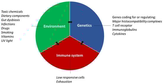 Defective self-tolerance was originally invoked as an explanation for the occurrence of diseases involving immune reactions to self-components [26,27]. Currently, a common theory is that both genetic dysfunction and environmental factors contribute to the development of autoimmunity (Figure 1) [4,5,17,22,28]. Here, genetic dysfunction relates to predisposition or genetic susceptibility, resulting in that the immune system becomes dysregulated and provides conditions for pathological damage, while environmental factors constitute triggers that make autoimmune diseases clinically apparent [17,28,29].