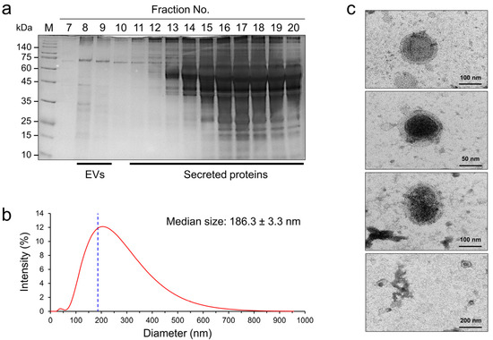 SDS–PAGE analysis of the fractions eluted from the qEV column showed that fractions 8 and 9 contained enriched NfEVs, with the highest concentration in fraction 8 (Figure 1a). Fractions 11–20 contained the secreted proteins. DLS analysis of NfEVs revealed that the sizes of the NfEVs ranged from 22.4 to 955 nm with a median of 186.3 ± 3.3 nm (Figure 1b). The highest intensity of NfEVs size was 220 nm, accounting for approximately 12%. TEM analysis of NfEVs revealed that the vesicles had a rounded shape with clear bilayered membrane structures (Figure 1c).