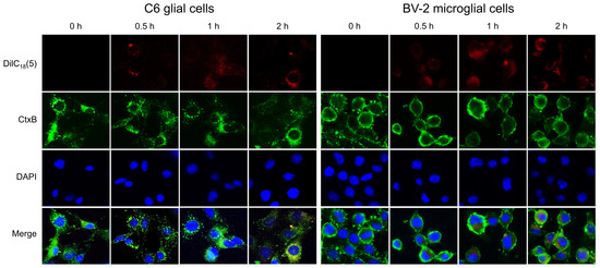 Internalization of NfEVs into mammalian cells. NfEVs (100 µg/mL) labeled with DilC18(5) (red) were incubated with C6 glial cells or BV-2 microglial cells for different time points. After 3 washes with PBS, the cells were stained with CtxB-Alexa (green) and DAPI (blue). NfEVs were identified in the cytoplasm of the cells, indicating NfEVs were internalized into the mammalian cells. The images were observed using an EVOS M5000 Imaging System at a magnification of ×40. Images are representative of the cell populations observed in three individual experiments.
