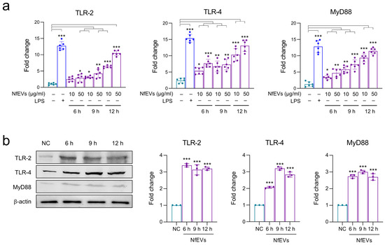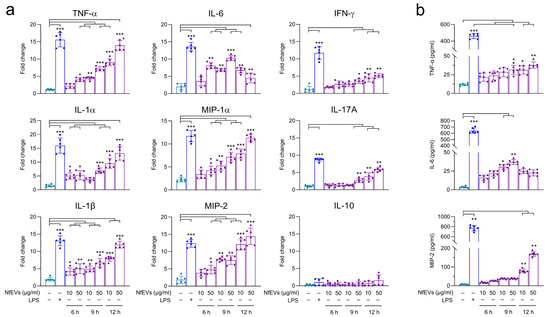 NfEVs induce productions of proinflammatory cytokines and chemokines in BV-2 microglial cells. (a) mRNA expression. BV-2 microglial cells were treated with different concentrations of NfEVs (10 µg/mL or 50 µg/mL) for different time points (6 h, 9 h, or 12 h). RT-qPCR was performed to analyze the expression pattern of each cytokine and chemokine. Bar graphs indicate the quantitative expression profile of each gene as a fold induction of each gene relative to nfgapdh in three independent experiments. (b) Quantitative ELISA. BV-2 microglial cells were treated with different concentrations of NfEVs for different time points. At indicated time points, the supernatant was collected and protein levels of TNF-α, IL-6, and MIP-2 were analyzed using ELISA. Values were presented as mean ± SD of three independent experiments. A one-way ANOVA with Dunnett’s post hoc test was performed as multiple comparisons with the negative control without treatment with either LPS or NfEVs. *** p < 0.0001, ** p < 0.001, and * p < 0.01.