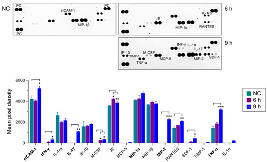 Next, the immune responses in BV-2 microglial cells treated with NfEVs were analyzed. The gene expression of TLR-2, TLR-4, and adaptor MyD88 was remarkably increased in NfEVs-treated BV-2 microglial cells in a time-dependent manner (Figure 3a). The protein expression of TLRs and MyD88 also increased until 9 h post-treatment with NfEVs (Figure 3b), suggesting that NfEVs initially stimulated the immune responses of the cells via MyD88-dependent TLR-2/TLR-4. Cytokine array analysis revealed that NfEVs induce the production of diverse cytokines and chemokines in BV-2 microglial cells. The levels of sICAM-1, IL-17, MIP-2, RANTES, and TNF-α were increased by treatment with NfEVs compared to those in the negative control without treatment with NfEVs. The expressions of other cytokines and chemokines, including IFN-γ, IL-1α, IP-10, M-CSF, MIP-1α, SDF-1, and TIMP-1, were also slightly increased by NfEVs (Figure 4). However, the increase in cytokine production was not high at short treatment less than 3 h, so we selected 6 h treatment of NfEVs to BV-2 microglial cells for further analyses. The enhanced expression levels of cytokines (TNF-α, IL-1α, IL-1β, IL-6, IL-10, IL-17A, and IFN-γ) and chemokines (MIP-1α and MIP-2) at the mRNA level were further confirmed using RT-qPCR. The expression levels of these genes, except IL-10, increased significantly in both time-dependent and dose-dependent manners in NfEVs-treated BV-2 microglial cells (Figure 5a). Consistent with the mRNA expression patterns, the protein levels of TNF-α, IL-6, and MIP-2 also increased in NfEVs-treated cells (Figure 5b).