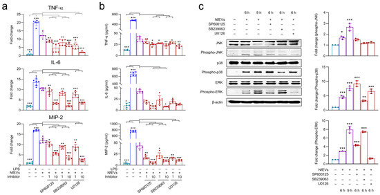 MAPK signaling pathways are involved in proinflammatory immune response of BV-2 microglial cells stimulated by NfEVs. (a) mRNA expression. BV-2 microglial cells were pre-treated with different concentrations (1 µM or 10 µM) of JNK inhibitor (SP600125), p38 inhibitor (SB239063), or ERK inhibitor (U0126) for 3 h. NfEVs (50 µg/mL) were then applied to the cells for 6 h. The mRNA expressions of TNF-α, IL-6, and MIP-2 were analyzed using RT-qPCR. Bar graphs indicate the quantitative expression profile of each gene as a fold induction of each gene relative to nfgapdh in three independent experiments. (b) Quantitative ELISA. Productions of TNF-α, IL-6, and MIP-2 were measured using ELISA. Values are presented as mean ± SD of three independent experiments. A one-way ANOVA with Dunnett’s post hoc test was performed as multiple comparisons with the control treated with NfEVs. (c) Phosphorylation levels of JNK, p38, and ERK in NfEVs-stimulated BV-2 microglial cells. To analyze phosphorylation levels of MAPKs, BV-2 microglial cells were pre-treated with JNK, p38, or ERK inhibitor (10 µM), respectively, and treated with NfEVs (50 µg/mL) for 6 h. Total proteins were extracted from the cells, and phosphorylation levels of JNK, p38, and ERK were analyzed via immunoblots using a specific antibody for each protein. The total JNK, p38, ERK, and β-actin were used as internal controls. Fold change (mean ± SD) means relative density change compared to negative control without treatment with NfEVs and inhibitor. *** p < 0.0001, ** p < 0.001, and * p < 0.01.